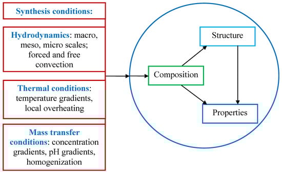 At the same time, traditional macroscale approaches based on the use of various kinds of mixing and ultrasonic devices, autoclaves, etc. in the processes of “wet” chemistry, allow a rather significant increase in productivity compared to the nano-approach, but the question of the quality of the resulting product, including the well-known triad “composition-structure-properties” (Figure 1) remains open.