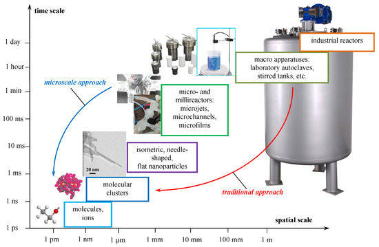 In Figure 2, the space and time levels of the formation of nanosized particles—from the atomic and ionic level through the nanosized particles, milli and microscale to the macro level are shown. Obviously, the traditional route from the large-sized macro-level devices to the nanosized particles is much longer than the way from milli and microscaled reactors, and accompanied by the formation of unnecessary by-products [1]. Hence, the milli and microreactors appear to be promising tools for the formation of nanosized particles.
