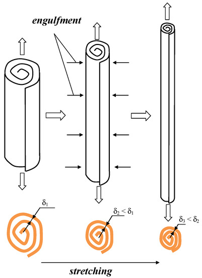 The evolution of the liquid elements in the form of microvortices and the engulfment is presented in Figure 3: the simultaneous stretching and elongation of the vortices result in the engulfment of the surrounding liquid. As a result, thinner layers of liquid are formed, and the thickness of the layer δ (see Figure 3) is responsible for the diffusion characteristic time: tdif ≈ δ2/D. Therefore, with thinner layers in microvortices much better micromixing is expected.