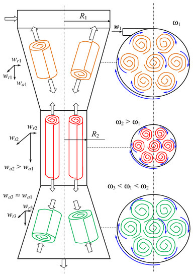 The flow, entering the confuser through the tangential branch pipe (Figure 4) with the initial velocity w1, swirls, with the tangential component of velocity is wt1. Moving from the cylindrical zone with the radius R1 to the neck area of the confuser with the radius R2, the flow is accelerated. In the case of an ideal fluid (i.e., with zero viscosity) in accordance with the angular momentum conservation law: