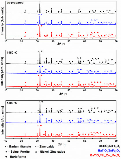 The XRPD patterns for as-prepared and sintered titanate/ferrite structures are shown in Figure 1. With the increase in sintering temperature, better crystallinity was obtained, irrespective of the investigated powder. Furthermore, peaks intensity belonging to barioferrite-like phases indicated the more intensive reaction between spinel and BaTiO3 at 1300 °C. The phase composition for each investigated powder is given in Table 1. The presence of spinel and tetragonal BaTiO3 phases can be clearly seen for as-prepared samples. The zinc oxide (ZnO) phase is also evident in the case of BaTiO3/ZnFe2O4 while for the BaTiO3/Ni0.5Zn0.5Fe2O4, barioferrite-like phase was formed during the thermal decomposition process. In the case of sintered samples, different barioferrite-like phases were formed. However, spinel and tetragonal BaTiO3 phases remain unchanged. The transformation of BaTiO3 from P4mm to P4/mmm space group was observed at 1300 °C in all studied cases.