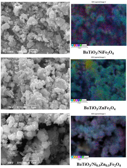 SEM and EDS layered images of non-sintered BaTiO3/NiFe2O4, BaTiO3/ZnFe2O4, and BaTiO3/Ni0.5Zn0.5Fe2O4 samples (Ba-cyan; Zn-yellow; Ni-orange; Fe-magenta; Ti-blue; O-green).