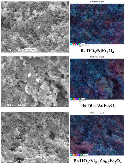 The SEM micrographs for as-prepared powders confirmed the presence of two types of particles, different in size and shape, Figure 2. The particles which belong to the BaTiO3 are bigger (0.5–1 μm) in comparison to ferrite particles that are in the sub-100 nm range. It was observed that ferrite particles formed agglomerates due to the size-driven surface activity [66,67]. The EDS maps of these samples confirmed the non-uniform distribution of barium-titanate and ferrite phases. The EDS layered images suggested that the best ferrite distribution over the titanate surface was achieved in the case of the as-prepared BaTiO3/NiFe2O4 composite, Figure 2. For the BaTiO3/ZnFe2O4 and BaTiO3/Ni0.5Zn0.5Fe2O4 powders clear separation of the Zn-rich phases was observed, Figure 2. These results are following XRPD analyses which showed the presence of a zinc oxide phase in the case of BaTiO3/ZnFe2O4 (Table 1). Furthermore, the lowest amount of the ferrite phase in the case of BaTiO3/ZnFe2O4, observed by XRPD (<30%, Table 2), indicates the sparse distribution of ZnFe2O4 over the BaTiO3 surface.