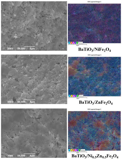 SEM and EDS layered images of BaTiO3/NiFe2O4, BaTiO3/ZnFe2O4, and BaTiO3/Ni0.5Zn0.5Fe2O4 samples sintered at 1150 °C (Ba-cyan; Zn-yellow; Ni-orange; Fe-magenta; Ti-blue; O-green).