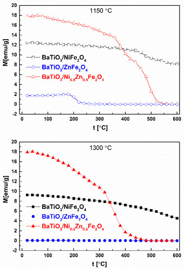In the latter case and in comparison, to BaTiO3/NiFe2O4 and BaTiO3/ZnFe2O4, mass magnetization enhancement can be explained by the most significant grain size increment as the sintering temperature increased, Figure 4 and Table 2. The change in mass magnetization value in the temperature range from 20 °C to 600 °C under the magnetic field of 50 kA/m for the sintered samples is presented in Figure 5. Magnetization of BaTiO3/NiFe2O4 and BaTiO3/ZnFe2O4 showed a similar trend upon heating, decreasing slightly, irrespective of sintering temperature. In the case of BaTiO3/Ni0.5Zn0.5Fe2O4 sintered at 1150 °C, there was a sharp fall in mass magnetization due to the phase transition caused by partial destruction of the domain structure within the crystallites from 340 °C to 400 °C, followed by a gentle fall in mass magnetization up to 480 °C. Then, the biggest fall due to thermal effects near Curie temperature (TC) about 540 °C occurred. It was shown that the BaTiO3/NiFe2O4 sintered at 1300 °C has a TC over 600 °C, while the TC value of its analogue sintered at 1150 °C is about 600 °C. In the case of BaTiO3/Ni0.5Zn0.5Fe2O4 sintered at 1300 °C, TC is significantly lower (≈420 °C). This can be explained by the fact that Curie temperature decreases with an increase in Zn content due to the weakening of A-B superexchange interaction caused by the replacement of Fe3+ by Zn2+ ions at tetrahedral sites.