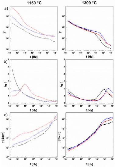 Dielectric properties of the sintered samples were determined by two digital LCR meters: Hameg 8118 (from 20 Hz to 90 kHz) and Agilent 4285A (from 90 kHz to 9 MHz), under normal atmospheric pressure, ambient temperature, and relative humidity of 40%. The applied voltage across the closed micrometer capacitor cell was 1.5 V. The capacitor cell was housed in a Faraday cage. To obtain broader frequency dependence of dielectric parameters (tg δ, ε’, Z’, Z”), frequency spectra were merged.