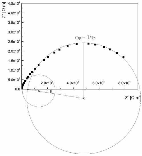 The EIS analyzer software and equivalent circuit consisting of two parallel R-CPE elements connected in series were applied for the investigation of relaxation processes. The representative curve for BaTiO3/NiFe2O4 sintered at 1150 °C, shown in Figure 7, indicates that experimental data can be fitted with two circles whose centers are not located on the Z’ axis. This type of modeled circle is typical for the samples which have no single relaxation time (τ), but several of them whose distribution can be presented with mean relaxation time (τp = ωp−1). This is characteristic of non-Debye relaxation in which the depression angle (θ) relates to the distribution width of the relaxation time due to the non-uniform grain boundary structure of the samples [75]. In our case, non-Debye relaxation originated not only from the porous structure, but from different phases and core-shell structures’ grain boundaries. Therefore, the fitting procedure included the use of two CPE instead of typical RC circuits.