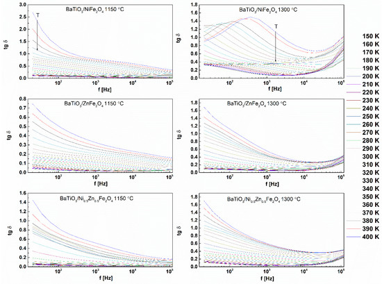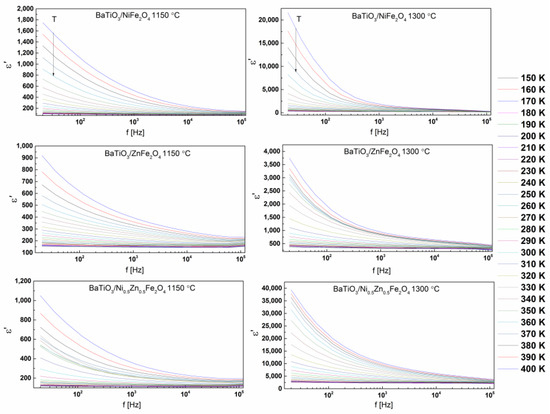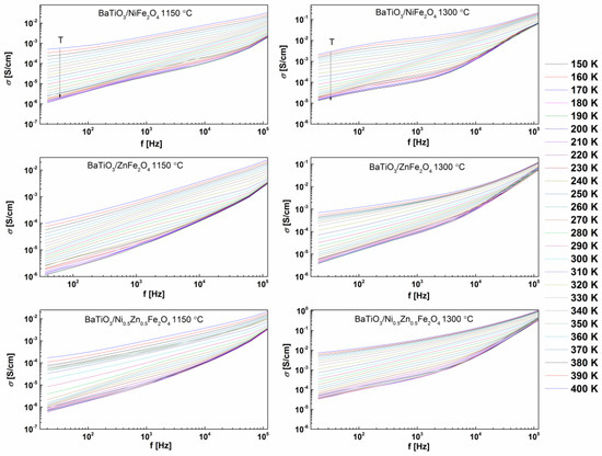 Variations of relative dielectric constant, tangent loss, and AC conductivity with the frequency for the selected temperature range (150–400 K) for all sintered samples are displayed in Figure 8, Figure 9 and Figure 10, respectively. The relative dielectric constant value is continuously reduced, exhibiting a plateau in the high-frequency region, irrespective of the investigated sample, Figure 8. The increase in permittivity in the low-frequency region with an increase in temperature can be addressed by nano-inhomogeneous conductivity of ferrite phases [76,77]. The frequency-dependent tangent loss values for the samples sintered at 1150 °C show a typical behavior of composites with inhomogeneous conductivity. Interestingly, in the case of samples sintered at 1300 °C, in the high-temperature range, the values of high-frequency tangent loss increased due to the defects in the material, including oxygen vacancies and transformation of BaTiO3 from P4mm to P4/mmm space group, Figure 9. From the AC conductivity spectra, presented in Figure 10, it is obvious that the conductivity exhibited a twist of about 104 Hz, deviating from the classical Jonsher relationship [78].