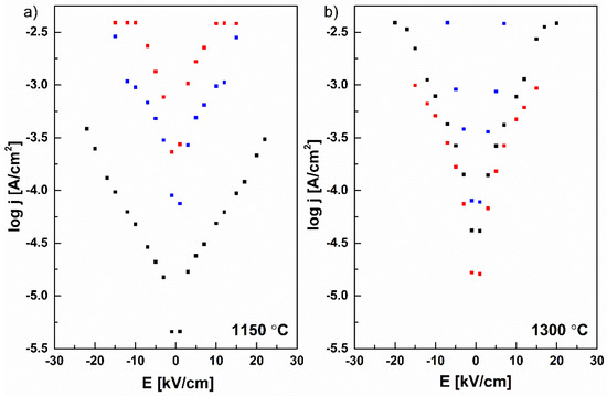 Leakage current measurements for the samples (a) sintered at 1150 °C, (b) sintered at 1300 °C (BaTiO3/NiFe2O4—black, BaTiO3/ZnFe2O4—blue, and BaTiO3/Ni0.5Zn0.5Fe2O4—red) as log j—E dependence.