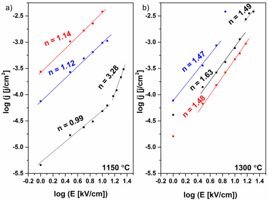 Leakage current measurements for the samples (a) sintered at 1150 °C, (b) sintered at 1300 °C (BaTiO3/NiFe2O4—black, BaTiO3/ZnFe2O4—blue, and BaTiO3/Ni0.5Zn0.5Fe2O4—red) as log j—log E dependence; n represents the slope of the curves in logarithmic plots.