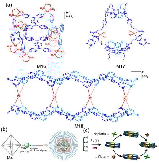 Drug encapsulation and delivery of metallacycles and metallacages. (a) The structures of M16−M18. (b) The nanoformulation of M4 for Pt drug delivery. (c) Selective binding of cisplatin and triflation in cavities. Adapted with permission from refs. [66,67,68,74]. Copyright 2017 American Chemical Society; 2018 Royal Society of Chemistry.