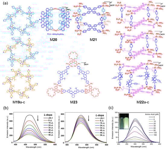 The recognition and isolation of metallacycles and metallacages toward complex biomolecules, including amino acids, sucrose, small molecule drugs, etc., make them potential candidates for chemical sensing and biotechnology. Cui et al. synthesized three chiral NH-functionalized fluorescent Zn-based metallacycles, M19a-c (Figure 4a) [31] and demonstrated their high binding affinity and enantioselectivity toward small-molecule pharmaceuticals (L-dopa, D-penicillamine), amino acids, and α-hydroxycarboxylic acids. The strong fluorescence allowed its application in chiral sensing (Figure 4b). Yoshizawa prepared a Pt-based metallacage M20 and reported the efficient and selective encapsulation of D-sucrose from natural disaccharide mixtures in water [76]. Zhang constructed a fluorescent metallacycle-cored supramolecular network by linking metallacycle M21 via a dynamic covalent reaction and showed that it can be used as a chemical sensor to detect picric acid and halogen ions [77]. Stang and coworkers prepared three multicomponent Pt-based metallacages, M22a-c [78]. Figure 4c demonstrates strong fluorescence sensing and has been utilized as a “turn-on” fluorescent sensor for the detection of thiol-containing amino acids, including cysteine and glutathione, in methanol/water, which follows a self-destructive mechanism. Moreover, M22 can also be regenerated by adding Pt(II) acceptors. Then, they designed a triangular metallosalen-based metallacycle M23, constructed a Pt(II) metallacycle-cored supramolecular network [34], and examined the amino acid sensing capability. The limits of detection for cysteine and glutathione were 79.1 and 15.4 μM, respectively.