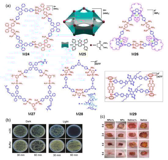 The antibacterial performance of metallacycles and metallacages. (a) The structures of M24−M29. (b) Pictures of the bacterial colonies of S. bacteria after exposure to M25 in 0.1 M acetate buffer with white light irradiation. (c) Photographs showing the infected wound after different treatments. Adapted with permission from refs. [85,86,87,88,89,90]. Copyright 2019 and 2022 National Academy of Sciences (USA); 2020 and 2022 Wiley-VCH; 2020 Nature Publishing Group; 2020 American Chemical Society.
