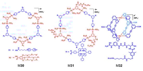 Pt-, Pd-, and Ru-based metallacycles and metallacages are widely used in cancer diagnosis and treatment [18,91,92,93,94]. Das generated two Pt(II)-based irregular hexagonal metallacycles and studied their cytotoxicity using various cell lines, including the A549, KB, MCF-7, and HaCaT cell lines [95]. The results showed that the smaller metallacycle exhibits better cytotoxic effects. They also prepared two other Pt(II)-based metallacycles with hexagonal shapes and confirmed their anticancer efficiency in comparison to cisplatin [96]. Stang and coworkers produced an effective drug delivery system based on the water-soluble hexagonal metallacycle M30 (Figure 6), which transports curcumin into different cancer cells. The encapsulation of curcumin results in the synergistic enhancement of M30 [97]. Yang presented porphyrin-functionalized star polymers through post-assembly polymerization of a hexagonal Pt(II)-based metallacycle M31 cisplatin [98]. The obtained metallacycle-linked star polymer showed an excellent ability to enhance cellular uptake and generate 1O2, and therefore, superior antitumor activity was observed under light irradiation. Combining the fluorescence, anticancer and targeted properties into a single entity, Zhang’s group prepared two biotinylated fluorescent Pt(II)-based metallacages, which were successfully employed for bioimaging, cancer treatment, and targeting [99].