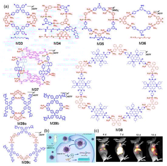 To further explore the in vivo biological application of metallacycles and metallacages, much research has been carried out. In this respect, Stang and coworkers have published a series of excellent works. They synthesized a four-armed amphiphilic polymer consisting of an AIE metallacycle M33 (Figure 7a) core and GSH-responsive arms [104]. After self-assembly into NPs and vesicles, the small molecule anticancer drugs doxorubicin or doxorubicin hydrochloride were further encapsulated. The results showed that the drug delivery system has a synergistic anticancer effect both in vitro and in vivo. A suite of Pt(II) drug-loaded metallacycle M34 was designed and synthesized for combination with cancer chemotherapy [105], in which the chemotherapy drugs camptothecin (CPT) and combretastatin A4 (CA4) were loaded in metallacycles. Nanoformulations (NFs) were fabricated by encapsulating M34 into folic acid (FA)-functionalized diblock copolymers, which exhibited high anticancer efficacy as well as few side effects (Figure 7b). In another study, they prepared NPs by self-assembly of an amphiphilic copolymer, which consisted of H2O2-responsive diblock copolymer arms and a hexagonal metallacycle M35 core [106]. The NPs can not only encapsulate doxorubicin and palmitoyl ascorbate but also show excellent antitumor performance with negligible systemic toxicity. The group also prepared a theranostic nanoprobe that incorporated rhomboidal Pt-based metallacycle M36 and NIR-II molecular dye. The applications for cancer diagnosis and treatment are shown in Figure 7c [107]. The nanoprobe provides accurate diagnosis with high resolution and can inhibit tumor growth with fewer adverse reactions than cisplatin via the enhanced permeability and retention (EPR) effect. A dual-emissive Pt-based metallacage M37 was reported [108]. The NPs formed by M37 and amphiphilic diblock copolymers demonstrate hypoxia imaging as well as chemotherapy in vivo. Mao et al. constructed a theranostic NIR metallacage M38 and developed it in MNPs for imaging-guided cancer radiochemotherapy, which revealed better antitumor performance against cisplatin-resistant tumors [109]. Zhang synthesized metallacycles M39a-c cored amphiphilic NPs formed by β-CD [110], which not only acted as contrast agents for cell imaging but also displayed increased anticancer activity.