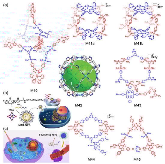 Due to its excellent therapeutic effects, negligible side effects, and noninvasiveness, photodynamic therapy (PDT) has recently gained increasing attention in cancer treatment. Through the ingenious design of structures, Therrien and coworkers incorporated photosensitizers into Ru-based metallacages and widely investigated their applications in PDT, in which the metallacages showed good therapeutic effects in cancer as well as rheumatoid arthritis [111,112,113]. Tang synthesized two amphiphilic Pt(II)-based metallacycles, which can potentially be applied to PDT [114]. Stang designed and synthesized Ru-Pt metallacycles and octahedral metallacage M40 (Figure 8a) via a photosensitizer based on Ru(II) and building blocks based on Pt(II), which demonstrated a large two-photon absorption cross-section as well as high efficiency of ROS generation [115]. After encapsulation into a polymer and the formation of NPs, excellent PDT performance was demonstrated in three-dimensional MCs and in vivo studies. They also described two porphyrin-containing Pt(II) metallacages, M41a and M41b, and examined their potential in PDT [116]. In vivo and in vitro investigations indicate the NPs containing M41a and M41b display enhanced antitumor effects with lower dosage requirements and very few adverse effects compared with the precursors. Dong reported an indocyanine green (ICG)-involved photoactive antitumor hexagonal nanoplate based on Pd(II) metallacage M42, which served as an efficient antitumor photosensitizer via PDT for increased NIR light-induced 1O2 generation, enhanced cellular uptake, and selective targeting ability of lysosomes [117]. Yang designed a dual-stage metallacycle M43 and constructed M43-loaded NPs that realized reversible control of 1O2 generation [118]. As a promising platform for selective PDT, the dual-stage system exhibits promising anticancer applications.