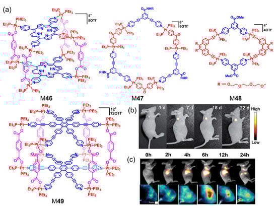 Multifunctional nanocarrier systems based on metallacycles and metallacages for cancer diagnosis and treatment have undergone great development in recent years. Chen et al. integrated a chemotherapy and PDT strategy utilizing a porphyrin- and Pt(II)-based metallacage M46 (Figure 9a) via multicomponent self-assembly, in which M46 served as a multimodality theranostic platform to fabricate NPs [121]. The cooperation of chemotherapy and PDT exhibited remarkable synergistic antitumor efficacy in vitro and in vivo. Kim constructed an NIR-II nanotherapeutic platform through the incorporation of Pt(II)-based metallacycle M47 and NIR-II dye into F127 [122]. The designed NPs showed high tumor uptake with superior photostability and a high signal-to-noise ratio for real-time guiding therapy, increasing the antitumor efficacy as well as reducing the adverse effects in the U87MG glioblastoma model.
