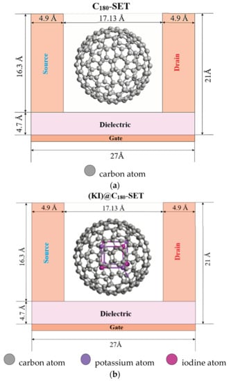 SET geometry: (a) C180-SET; (b) (KI)@C180-SET.