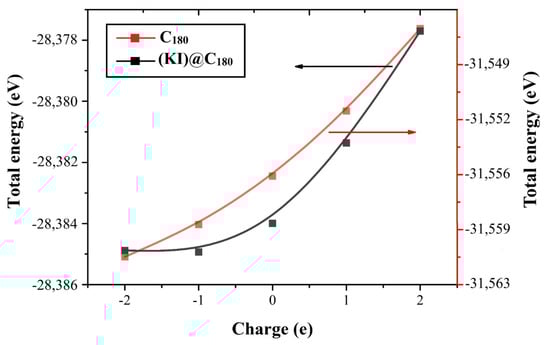 Figure 2 shows the dependence of the total energy of the fullerene molecules on the charge state. Based on the results of the total energy calculations, it is shown that, with a negative value of the charge, the total energy was higher than with a positive one. The total energy of fullerene with a neutral charge was −28,383.99233 eV, and for endohedral fullerene (KI)@C180-SET, −31,556.29148 eV. Table 1 shows the numerical data on the dependence of the total energy on the state of charges.