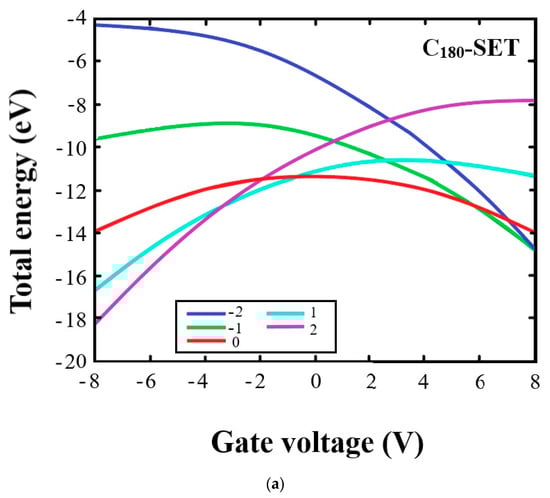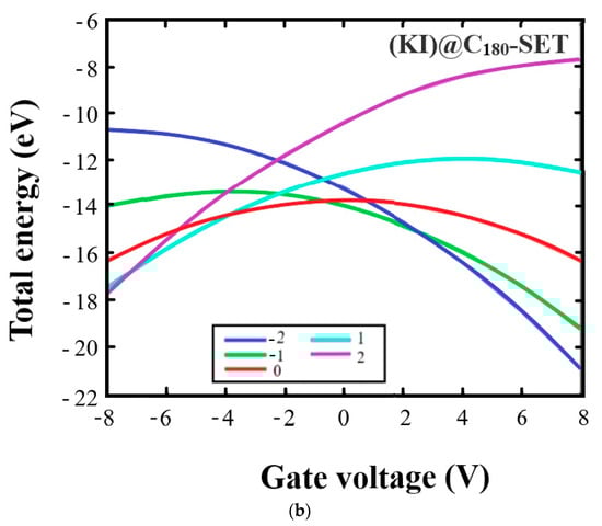 Figure 3 shows the dependence of the total energy on the gate voltage (VG) for the C180- and (KI)@C180-based SETs for different charge states. As can be seen, at VG > 0, the state of negative charge (Q = −1, −2) showed a significant decrease in the total energy of the SET, making it stable at positive values of VG. From Figure 3a for C180, we observe that, when the voltage reached 8 V, the graphs related to the negative charges Q = −1, −2 practically connect. However, when the fullerene KI was included in the cavity, the electrical properties changed, and the graphs characterizing the negative charges Q = −1 and −2 intersect already at a voltage of ~2.5 V and E ≈ −15 eV (Figure 3b). At VG < 0, the positive state of charge (Q = 1, 2) was more stable relative to the negative state due to the shift in the levels of the highest free and lowest free molecular orbitals with the gate voltage. In C180 fullerene, the graphs characterizing states with Q = 1 and 2 have an intersection point at V ≈ −2.8 V and E ≈ −13 eV. In the (KI)@C180 system, states with positive charges Q = 1 and 2 have intersections at the points V ≈ −7.3 V and E ≈ −17 eV. We also observed significant differences when comparing Figure 3a,b in systems with zero charge. Thus, the energy maximum in C180 was fixed at ≈ −12 eV and in (KI)@C180, ≈ −14 eV.