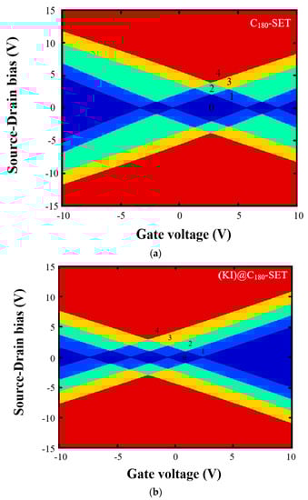 When the charge of the Coulomb blockade is overcome, it is transferred from to the SET. To overcome it, it is necessary to apply sufficient charge energy by adjusting the gate potential and the electrode voltage. For given values of the gate voltage and bias voltage (VSD), the number of molecular energy levels within the bias window is given by the color codes in Figure 4a,b.