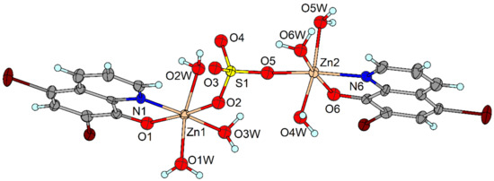 The complexes [Zn2(dClQ)2(H2O)6(SO4)] (4) and [Zn2(dBrQ)2(H2O)6(SO4)] (5) crystallize in the triclinic P1 space group and their structures are very similar. They are formed by binuclear complexes in which two Zn-species are bridged by a sulphate group (Figure 9). Both Zn atoms in the binuclear complexes are hexacoordinated by a corresponding N,O-bidentate chelate XQ ligand, three oxygen atoms of water molecules and one oxygen atom of the sulphate group. Interestingly, in 4 there are four crystallographically independent binuclear complexes. However, due to the extremely small crystals of 4, their diffraction power was low, and thus the quality of the obtained data enabled us to present only an isotropic model of its structure without hydrogen atoms. Therefore, we discuss neither bond distances and angles nor nonbonding interactions in this complex.