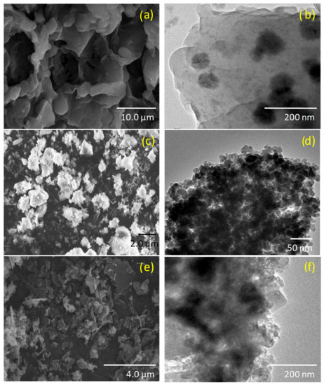 SEM and TEM monographs of (a,b) NRGO, (c,d) NiV, and (e,f) the NiV/NR hybrid.