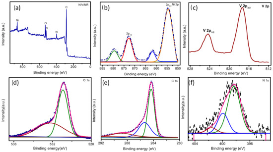 XPS of (a)the NiV/NR hybrid survey spectrum (b) Ni 2p, (c) V 2p, (d) O 1s, (e) C 1s and (f) N 1s.