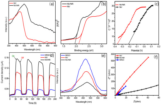 The photoelectrochemical properties of the synthesized materials were examined using a time-resolved photocurrent experiment. Figure 4d shows the photocurrent response is in the order NiV/NR > NiV > NRGO. The NiV/NR hybrid exhibited relatively high current density compared to the other two, which indicates the efficient separation of photoexcited electrons and holes [39]. The charge transfer ability of the prepared photocatalysts was further estimated by photoluminescence (PL) spectroscopy (Figure 4e). Low emission peak intensity and a slight shift towards higher wavelengths are observed in the NiV/NR hybrid, which indicates the effective separation of electrons and holes during photoredox reactions. Electrochemical impedence spectroscopy (EIS) studies were evaluated to understand the charge transfer resistance in the samples, and the plot is given in Figure 4f. The NiV/NR hybrid exhibits low arc radius and, hence, high charge transfer ability and low charge transfer resistance [40]. The optical, photo/electrochemical characterization results indicate the enhanced characteristics of NiV upon anchoring it with NRGO for efficient photocatalysis.