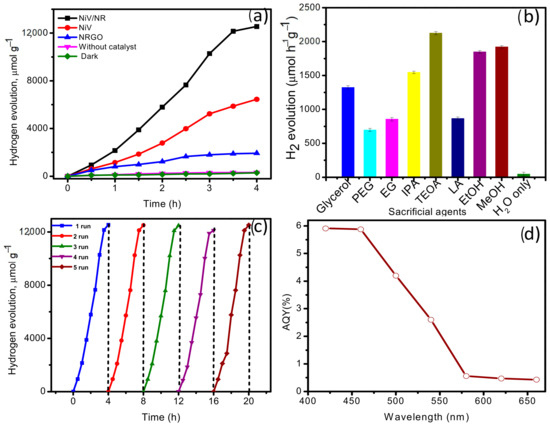 Sacrificial agents used for photocatalysis play an important role in efficient H2 evolution. Therefore, different sacrificial agents that are commonly used have been evaluated in the presence of the NiV/NR hybrid and the results are given in Figure 5b. No activity is seen in a system consisting of only water, indicating the major role played by sacrificial agents. Less activity is observed in the presence of lactic acid (LA), polyethylene glycol (PEG), and ethylene glycol (EG). A good amount of H2 evolution is observed in the presence of MeOH, etOH, and isopropyl alcohol (IPA). Better activity toward the evolution of H2 is observed in TEOA. Increased H2 evolution is observed in the TEOA-water system, which could be attributed to the effective dispersion and binding of TEOA to the NiV/NR hybrid [41]. To know the ability to evolve H2 for a longer time, stability studies of the NiV/NR hybrid have been examined and are given in Figure 5c. No deviation is observed in the first two runs. The third and fourth runs exhibit a slight decline in activity due to a lowered concentration of the sacrificial agent. A fresh sacrificial agent was added after the 4th run and the activity was normal. This indicates the good stability of the NiV/NR hybrid. The apparent quantum yields (AQYs) were determined using a 420-nm bandpass filter and calculated using Equation (2). The AQY of the NiV/NR hybrid is found to be 5.91% (Figure 5d) and shows good efficiency towards the absorption of light in the visible region.