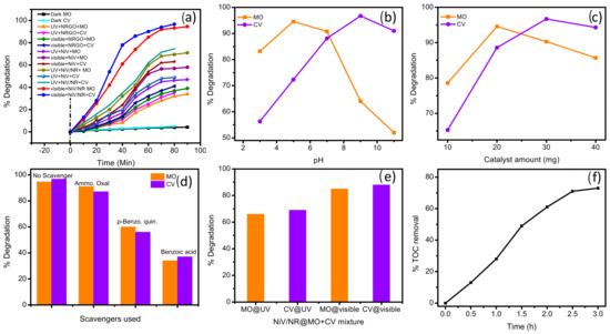Photocatalysis is a multistep reaction that depends mainly on the medium in which it occurs, i.e., the pH of the solution. Figure 6b depicts the effect of pH on the degradation of MO and CV in the presence of the NiV/NR hybrid under visible light. The maximum degradation observed is at acidic pH (pH-5) for MO and basic pH (pH-9) for CV. Being an anionic dye, MO shows a very good electrostatic force of attraction at acidic pH due to the availability of excess H+ ions. At the same time, in basic pH, due to the repulsions of both the hydroxyl ions and dye, the degradation observed is low. In contrast, the cationic dye (CV) exhibited greater degradation in an alkaline pH since it is drawn electrostatically towards the surface of the catalyst and the generation of a high amount of hydroxyl ions. The amount of catalyst required to degrade the fixed amount of dye concentration is also an important factor for practical applications. The amount of catalyst varied from 10 to 40 mg for degradation of MO and CV under visible light (Figure 6c). It is found that 20 mg and 30 mg are required for efficient degradation of MO and CV, respectively. More than 20 and 30 mg of the Ni/NR hybrid for degradation of MO and CV was found to decrease the efficiency due to inactivation of the catalyst surface due and improper penetration of the light. A scavenger study was conducted to know the reactive species responsible for the degradation of MO and CV. Figure 6d shows the effect of different scavengers for holes (ammonium oxalate), superoxide radicals (p-benzoquinone) and hydroxyl radicals (benzoic acid) upon degradation of MO and CV in presence of NiV/NR [42]. The result shows the order of reactivity •OH > •O− > h+. The involvement of holes is less, and hydroxyl radicals and superoxide radicals are the main reactive species responsible for the degradation of MO and CV.