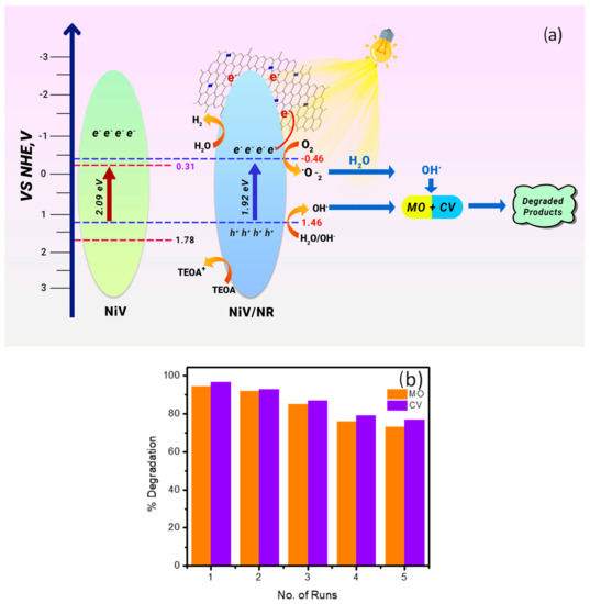 Photocatalytic degradation is a multistep reaction that involves many factors such as bandgap, edge potentials, reactive species involved, and conductivity. Based on the UV-DRS, Mott–Schottky, and scavenger study results, a probable mechanism has been predicted and given in Figure 7a. The conduction band (ECB) potential of NiV and NiV/NR hybrid follows n-type semiconductors and is considered to be −0.31 and −0.46 V, respectively. The active material is NiV, which can absorb light radiation and undergo excitation. The excited electrons may immediately recombine, and hence the photocatalytic degradation ability in NiV is less. Despite the fact that the bandgap of NiV is 2.2 eV, its efficiency towards dye degradation (MO and CV) is insufficient due to the quick recombination of holes and electrons. NiV is adorned with N-doped RGO to increase its efficiency. RGO is a stable, flexible, and highly conductive material that acts as a channel for electron mobility. Doping N into the RGO matrix is simple and improves RGO activity by producing defects in the matrix, and the lone pair of electrons in the heteroatom N may also play a role in the photoredox reaction. When NRGO is connected to NiV, the excited electrons at NiV are carried away by the N-doped RGO, lowering charge carrier recombination and thereby increasing NiV’s photocatalytic efficiency. This leads to the generation of superoxide radicals later in the presence of water-generated hydroxyl radicals. The photo-oxidation of water takes place at the valence band in the presence of oxygen to generate hydroxyl radicals. The hydroxyl radical attacks the organic molecule and successively degrades MO and CV into less harmful products. At the same time, in the photocatalytic H2 evolution reaction, the oxidation of TEOA takes place at VB, and the electrons in the CB of the NiV/NR hybrid are utilized by water to undergo reduction to evolve hydrogen.