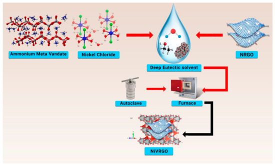 NiV/graphene-based materials were synthesized by using the reflux method, ultrasonic, sol-gel, solvothermal, and high-temperature solid-state methods [23,24,25,33,34]. The synthesis of NiV/N-doped RGO (NiV/NR) hybrid material has not been explored through the deep eutectic solvent (DES) method. The advantages of using DESs are their economy, non-toxicity, and ease of accessibility.
