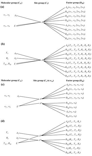 There were, as briefly mentioned above, three crystallographically non-equivalent ammonia ligands in compound 1. Among these, two ammonia molecules from the formula unit were in positions of trivial symmetry (type I). The other two ammonia molecules were crystallographically different and both were located on xz planes of symmetry (type II). Thus, the number of modes (external or internal) for the two crystallographically different ammonia molecules (type II) needed to be doubled. The correlation tables for the internal and external modes of ammonia molecules are given in Figure 3.