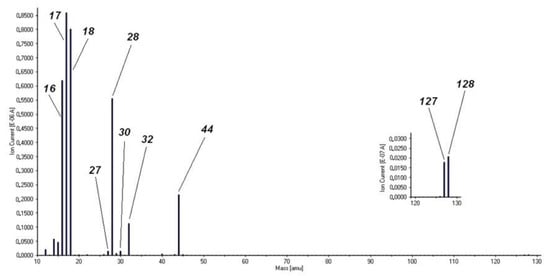 The m/z = 28 peak may have been due to N2+ and CO+ (the latter a CO2+ fragmentation product), therefore the intensity ratios of 44/30 (CO2++N2O+/NO+) and 44/28 (N2O++CO2+/CO++N2+) were compared, which showed that the main component of the m/z = 28 peaks was the N2+. Comparison of the intensity ratios of the peaks with 18/17 (H2O+/OH++NH3+), 17/16 (NH3++OH+/NH2++O+), 16/15 (NH2++O+/NH+) and 15/14 (NH++NO2+/N+) [52] showed that the main component of m/z = 17 and 44, were ammonia and carbon dioxide, respectively.