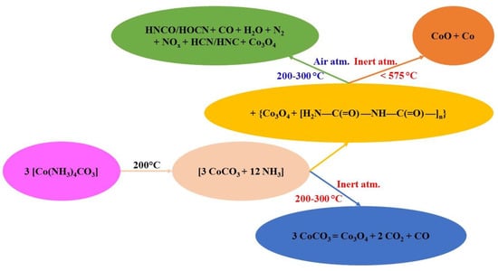- The subsequent decomposition of the intermediate [Co(NH3)4CO3] was not the same in inert and in oxygen-containing atmosphere. Cobalt(II) carbonate does not form [Co(NH3)4CO3] or other complex in an NH3 stream [55], and the only known ammine complex of cobalt(II) carbonate, Co(NH3)3CO3·4H2O prepared in aq. ammonia solution is very unstable even at room temperature. Thus, [Co(NH3)4CO3] was expected to be a metastable compound at 200 °C. In the absence of air, ligand loss reactions and interactions between the NH3 and CO2 (carbonate) components resulted in the formation of C-N bonds containing intermediates.Since the oxidation number of cobalt in [CoII(NH3)4CO3] increased during the Co3O4 formation (CoIICoIII2O4) in the oxygen-free environment, 25% of the oxygen content of Co3O4 had to originate formally from carbon dioxide [CoII(NH3)4CO3 = CoIIO + 4NH3 + CO2]. This oxygen transfer should be accompanied by the formation of carbon compounds with reduced oxygen content (the O/C ratio should be <2, because the O/C ratio is 2 in CO2). Based on the TG-MS, XRD and IR results (Figures S7–S9) the intermediate CoCO3 may be decomposed into Co3O4 and CO [56], or a quasi-intramolecular redox reaction of [Co(NH3)4CO3] may result in the formation of the C-N bond containing intermediates as urea, biuret or other amides, which in situ transforms into HNCO/HOCN type decomposition products at ~200 °C (the decomposition points of urea and biuret are 132.7 °C and 190 °C, respectively). The amount of organic compounds formed in inert atmosphere is enough to reduce Co3O4 into CoO and partly into metallic Co (Scheme 1).