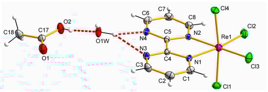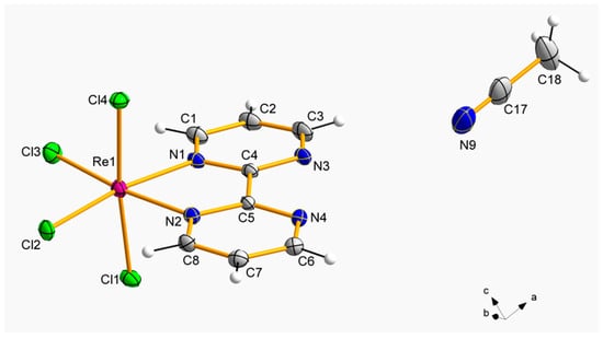 The crystal structures of 1 and 2 were studied through the single-crystal X-ray diffraction technique. Both compounds crystallized in the monoclinic crystal system with space groups P21/n and P21/c, respectively (Table 1). The non-solvated [ReCl4(bpym)] complex crystallizes in the orthorhombic space group P212121 [26]. The crystal structure of 1 is made up of neutral [ReCl4(bpym)] complexes and MeCN molecules, whereas the crystal structure of 2 is based on [ReCl4(bpym)], CH3COOH and H2O molecules, as shown in their respective asymmetric units (Figure 1 and Figure 2).