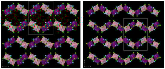 Hirshfeld surfaces of the neutral [ReCl4(bpym)] complex in compounds 1 and 2 were calculated. The close intermolecular interactions were analyzed through the CrystalExplorer program and compared with those of the non-solvated [ReCl4(bpym)] complex [35,36,37]. CrystalExplorer calculates a series of surfaces which allow users to obtain both a qualitative and quantitative visualization of the main intermolecular interactions. In this case, taking place in 1 and 2, the shorter contacts are shown using a red color [38,39]. This is performed by mapping the distances from the surface to the nearest atom outside (de) and inside (di) of each surface and, at the same time, assuming a normalized contact distance (dnorm) that considers some limitations generated by the atomic radii [35,36,37]. The Hirshfeld surfaces for these bpym-based compounds are given in Figure 5, Figure 6 and Figure 7 and Figures S1–S3 (Supplementary Materials). According to their fingerprint plots, both 1 and 2 show a very similar percentage regarding the intermolecular Cl⋯Cl contacts between adjacent [ReCl4(bpym)] complexes (ca. 6.4% for 1 and ca. 6.3% for 2), which is consistent with the similar framework based on halogen bonds that both compounds exhibit (Figure 8). The Cl⋯H contacts, primarily connecting chloride anions and C-H groups of neighboring [ReCl4(bpym)] complexes in 1 and 2, and the methyl groups of CH3COOH molecules in the case of 2, are the main interactions observed on the Hirshfeld surfaces for both compounds, which cover ca. 34.9% for 1 and ca. 39.2% for 2 on their respective fingerprint plots (Figure 5 and Figure 6). Finally, further N⋯H contacts involving solvent molecules, mainly MeCN (in 1) and H2O (in 2), and N atoms and C-H groups of adjacent bipyrimidine rings, are approximately 11.6% and 9.7% of the complete fingerprint plot of 1 and 2, respectively (Figure 5 and Figure 6). In Figure 6, a small asymmetric region close to the di values (1.2–1.4) is observed, which could be the result of some structural disorder, as previously reported [40,41,42,43]. The fingerprint plots for the non-solvated [ReCl4(bpym)] complex show a similar percentage for the intermolecular Cl⋯Cl contacts (ca. 6.0%) and a higher contribution of the Cl⋯H interactions (ca. 43.5%), involving chloride anions and C-H groups of bipyrimidine rings of adjacent [ReCl4(bpym)] complexes (Figure 7 and Figure S3).