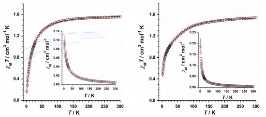 Thermal variation of the χMT product for compounds 1 (left) and 2 (right). The solid red line represents the theoretical fit of the experimental data and the inset shows the χM versus T plot.