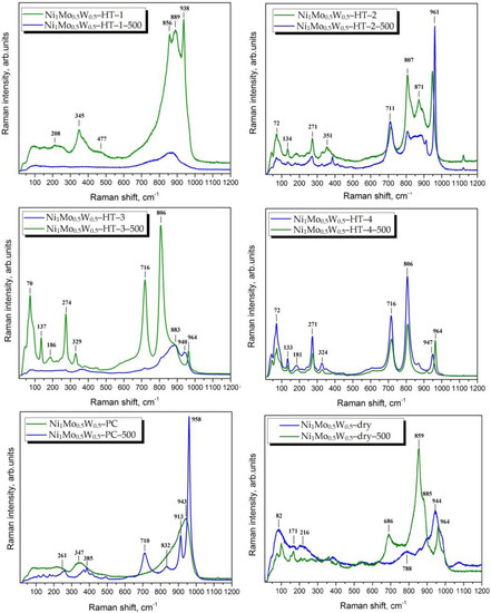 - Popovych, O.M.; Budzulyak, I.M.; Yukhymchuk, V.O.; Budzulyak, S.I.; Popovych, D.I. Raman Spectroscopy of Nickel Molybdate and Its Modifications. Fuller. Nanotub. Carbon Nanostructures 2021, 29, 1009–1015. [Google Scholar] [CrossRef]