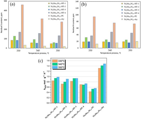 - Nadeina, K.A.; Budukva, S.V.; Vatutina, Y.V.; Mukhacheva, P.P.; Gerasimov, E.Y.; Pakharukova, V.P.; Klimov, O.V.; Noskov, A.S. Unsupported Ni–Mo–W Hydrotreating Catalyst: Influence of the Atomic Ratio of Active Metals on the HDS and HDN Activity. Catalysts 2022, 12, 1671. [Google Scholar] [CrossRef]