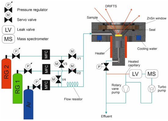 The DRIFTS apparatus comprises four sections: gas supply, reactor cell, optics, and gas analytics. In the gas supply part (left side of Figure 1), the gas bottles are attached to mass flow controllers (MFCs) through pressure regulators. The MFCs are connected to a network of tubes and servo valves, which are used to flush the gas supply lines when switching gases during a measurement. While a reactive gas (RG) is in use, the respective horizontal shut-off valve (V1/V2) is open and the corresponding vertical flush valve (V3/V4) is closed. In this way the carrier gas goes through the flow resistor and mixes with the reactive gas at the T-junction. If a reactive gas is to be shut off, first the MFC is closed and subsequently the flush valve is opened. Due to the flow resistance, the carrier gas now mainly flows through the RG line, removing any residual reactive gas. After 15 s, both the horizontal (V1/V2) and the vertical (V3/V4) valves are closed and the reactor can resume normal operation. Without this flush system, purging the reactive gas line to below the mass spectrometer (MS) detection limit can take up to 2 h.