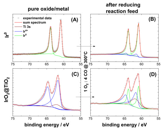 The XP spectra in the Ir 4f binding energy region of the IrO2@TiO2 and Ir0 + TiO2 samples are summarized in Figure 2A,C. The fit parameters used can be found in the literature [35,36,37,38] and in Table S1. According to the Ir 4f spectrum in Figure 2C, iridium is fully oxidized in the case of IrO2@TiO2. Additionally, the spectrum shows a small signal of Ti 3s stemming from the TiO2 support. Attempts to reduce IrO2@TiO2 are made, with the harshest reduction conditions being 4% H2 at 600 °C for 24 h. It is, however, not possible to produce pure metallic particles, as shown by the XP spectra in Figure S5. The spectra of the mixture of Ir0 + TiO2 are dominated by the Ti 3s signal so heavily that a meaningful deconvolution is not possible, therefore the pure Ir0 powder was used instead for XPS analysis. Here the Ir 4f XP spectrum shows pure metallic Ir0. Under reducing CO oxidation conditions (1% O2/4% CO/95% Ar), the XP spectra of Ir0 + TiO2 and IrO2@TiO2 in Figure 2B,D, respectively, indicate spectral features of both metallic and oxidic Ir. For Ir0 + TiO2 this effect seems to be less pronounced than for IrO2@TiO2, which is likely due to the large size of the Ir0 particles that can only be oxidized at the surface, so that the XPS signal is dominated by the bulk metal signal.