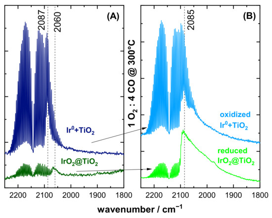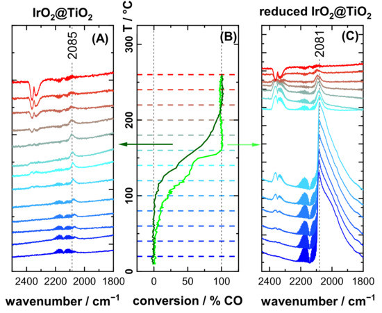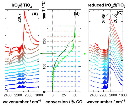 Figure 3A shows the CO DRIFT spectra of IrO2@TiO2 and Ir0 + TiO2. As the samples consist of pure IrO2 and pure metal Ir0, as demonstrated by the XPS, the DRIFT data serve as benchmark spectra to firmly assign characteristic spectral features of the DRIFT spectra during the CO oxidation. Here, only one distinct signal at 2060 cm−1 and 2087 cm−1 is revealed for IrO2@TiO2 and Ir0 + TiO2, respectively. However, the band position of IrO2@TiO2 at 2060 cm−1 varies under reaction conditions slightly with the temperature (cf. Figure 4A). As such, the oxidation state of the catalyst cannot unambiguously be derived from band position in DRIFTS alone.