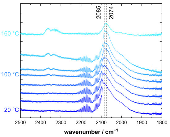 Infrared (IR) spectroscopy has been demonstrated to be a powerful technique in catalysis research for identifying reaction intermediates at the catalysts’ surface [9]. Employing a probe molecule, such as CO, infrared spectroscopy can also be used to probe the status and chemical nature of the active phase of the catalyst [10,11]. There are several benefits of using CO as a probe molecule in infrared spectroscopy [12,13], most notably the large cross section of CO for IR absorption and the convenient frequency range of around 2000 cm−1. The actual stretching frequency of the adsorbed CO depends sensitively on many parameters, including the adsorption site (coordination of CO), the local chemical environment, the coverage of CO, the occupation of d-orbitals of the active component, the oxidation state of the coordinated metal ions, and the electric field at the surface [14]. This renders CO a versatile probe molecule to explore the properties of the catalyst’s surface.
