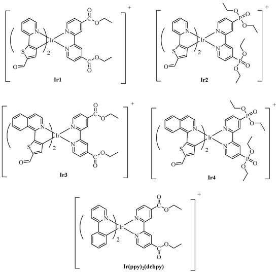 - Deaton, J.C.; Castellano, F.N. Archetypal Iridium(III) compounds for optoelectronic and photonic applications: Photophysical properties and synthetic methods. In Iridium(III) in Optoelectronic and Photonics Applications; Zysman-Colman, E., Ed.; John Wiley & Sons Ltd.: New York, NY, USA, 2017; pp. 1–69. [Google Scholar] [CrossRef]