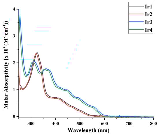 The photophysical properties of the iridium(III) complexes are explored in dichloromethane at room temperature. Their distinctive UV/Vis absorption spectra are recorded in Table 1, and a depiction of their spectra is provided in Figure 2. All of the dyes displayed strong absorption in the UV region at 290–320 nm, originating from intra-ligand charge transfer transition [61]. Spin-allowed π to π* ligand-centered electronic transitions on both the C^N and N^N ligands provide the intense band at roughly 380 nm [31]. Metal-to-ligand charge transfer (MLCT) and ligand-to-ligand charge transfer (LLCT) were both thought to be responsible for the wide absorption bands above 400 nm [41]. These compounds showed higher absorption intensities in the visible region than the classical [Ir(ppy)2(dcbpy)]+ complex [27,28], which indicates that Ir1–Ir4 had a better light-harvesting capability than that of [Ir(ppy)2(dcbpy)]+ [27,28,62]. In the range of 350–600 nm, the extended π-conjugation caused by the isoquinoline moiety in Ir3 and Ir4, resulted in broader absorption peaks with higher ε values than those of Ir1 and Ir2 [29,63]. Compared with [Ir(ppy)2(dcbpy)]+, the lowest energy MLCT band in all of the Ir(III) dyes was red-shifted [64], which can be explained by the extended π-conjugation in their C^N ligands [58,65]. Having a high ε value in both the UV and visible light areas is widely considered to be a necessary characteristic of a photosensitizer for photocatalytic water-splitting hydrogen generation [58], and incorporating isoquinoline moiety in our dyes should enhance the photocatalytic hydrogen generation performance, as compared to classical iridium(III) dyes [66,67]. It is worth noting that the nature of the anchoring group only marginally affects the absorption properties of the iridium(III) dyes [44,68,69,70,71,72,73].