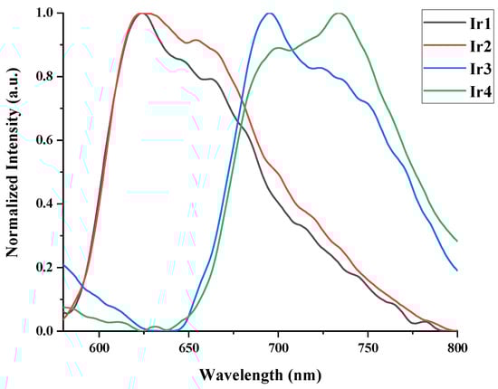 Photoluminescence spectra of Ir1−Ir4 in a dichloromethane solution were measured at room temperature (Figure 3). Under photoexcitation at 450 nm, all of the Ir(III) dyes exhibited structured spectral emission ranging from 623 to 734 nm, resulting from the mixture of 3MLCT and LC 3π to π* [74,75,76]. Significantly red-shifted emissions were observed in complexes Ir3 and Ir4, as compared to Ir1 and Ir2. This may be attributed to the extended π-conjugated in the cyclometalating ligands in Ir3 and Ir4 [31]. As shown by the PL data, changing the ligands efficiently tunes the photophysical characteristics.