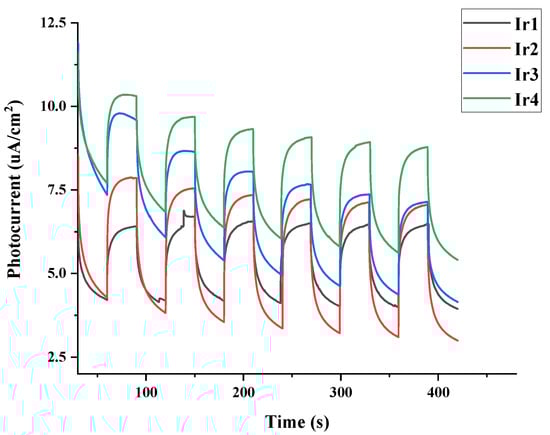 Photocurrent measurement was used to test the stability and the relative effectiveness of charge separation of our metal complexes [87]. A uniform and fast photocurrent response during light-on/light-off testing indicates stable photocatalytic activity [88], while high photocurrent density indicates good charge separation efficiency [89]. Photocurrent measurements were conducted according to the previously reported procedure [90]. Figure 6 illustrates the photocurrent responses of Ir1–Ir4 under visible light irradiation for six on-off cycles, which provides clear evidence of the electron transfer efficiency [90], thereby indicating their stable photocatalytic activities [88]. Ir4 exhibited a significantly higher photocurrent intensity during light-on and decreased with a noticeable delay during light-off, thereby indicating its superior charge separation efficiency and better H2 generation performance than the other three dyes [88,90,91,92].