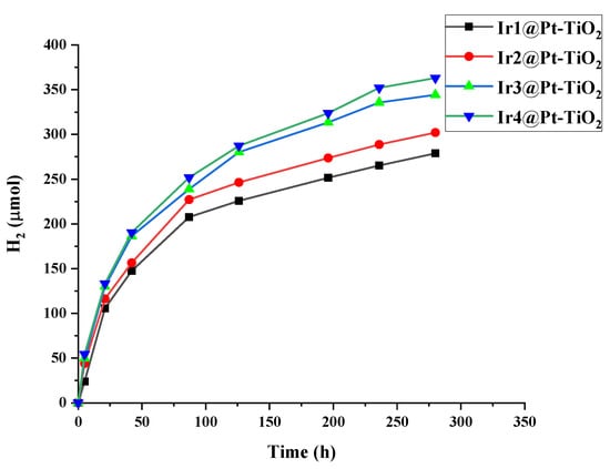Ir1–Ir4@Pt-TiO2 photocatalytic H2 production curves under illumination with green LEDs (50 mW).